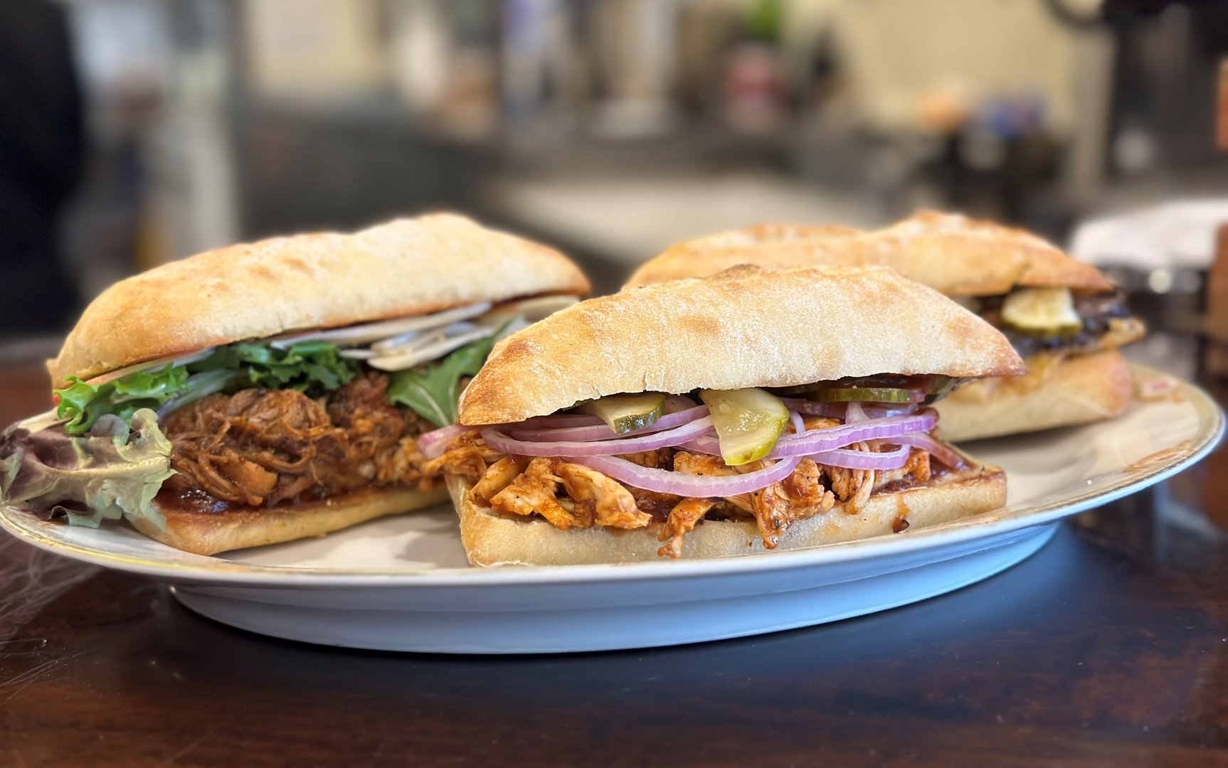 pulled chicken, smoked bacon, garlic aioli, greens, tomato jam, ciabatta bun
